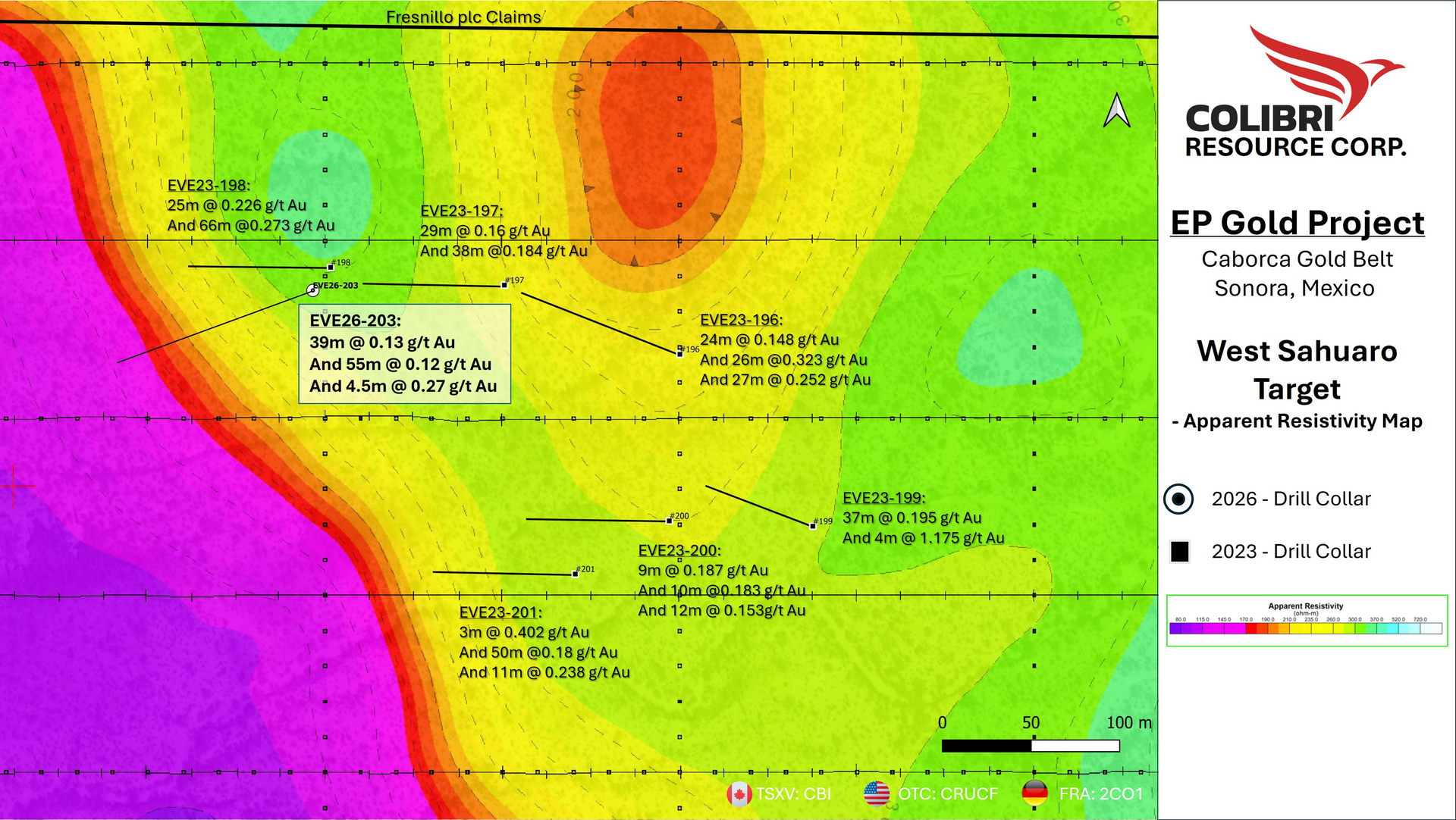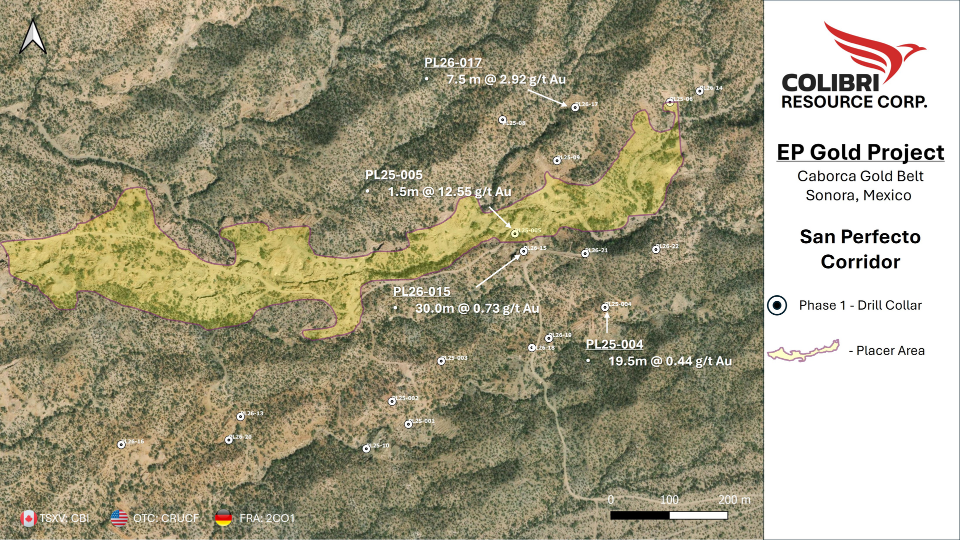 Ian McGavney, President and CEO of Colibri Resource Corporation, commented: “We are extremely pleased with the results from our maiden drill program at the Plomo claims. Intersecting gold mineralization in 18 of 22 holes, including 7.5 metres grading 2.92 g/t gold and 30.0 metres grading 0.73 g/t gold from near surface, represents a strong start and provides compelling evidence of a broad mineralized system along the San Perfecto corridor. In addition, the results from Banco de Oro, where drilling intersected 30 metres grading 0.45 g/t gold including higher-grade intervals, further demonstrate the potential for multiple mineralized zones within the Plomo claim block. Together with the encouraging results from West Sahuaro, these results continue to strengthen our belief that the EP Gold Project hosts one or more significant gold system within the Caborca Gold Belt.”