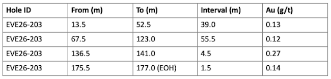 Drill hole EVE26-203 was completed to test the interpreted northwest-trending structural corridor at the West Sahuaro target using a drill orientation of approximately 240°. The hole intersected multiple broad intervals of anomalous gold mineralization hosted within altered and fractured rhyolite, confirming the presence of stacked mineralized panels associated with the structural corridor. The hole was drilled to a total depth of 177 metres and terminated in anomalous gold mineralization, indicating that the system remains open at depth.